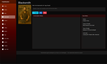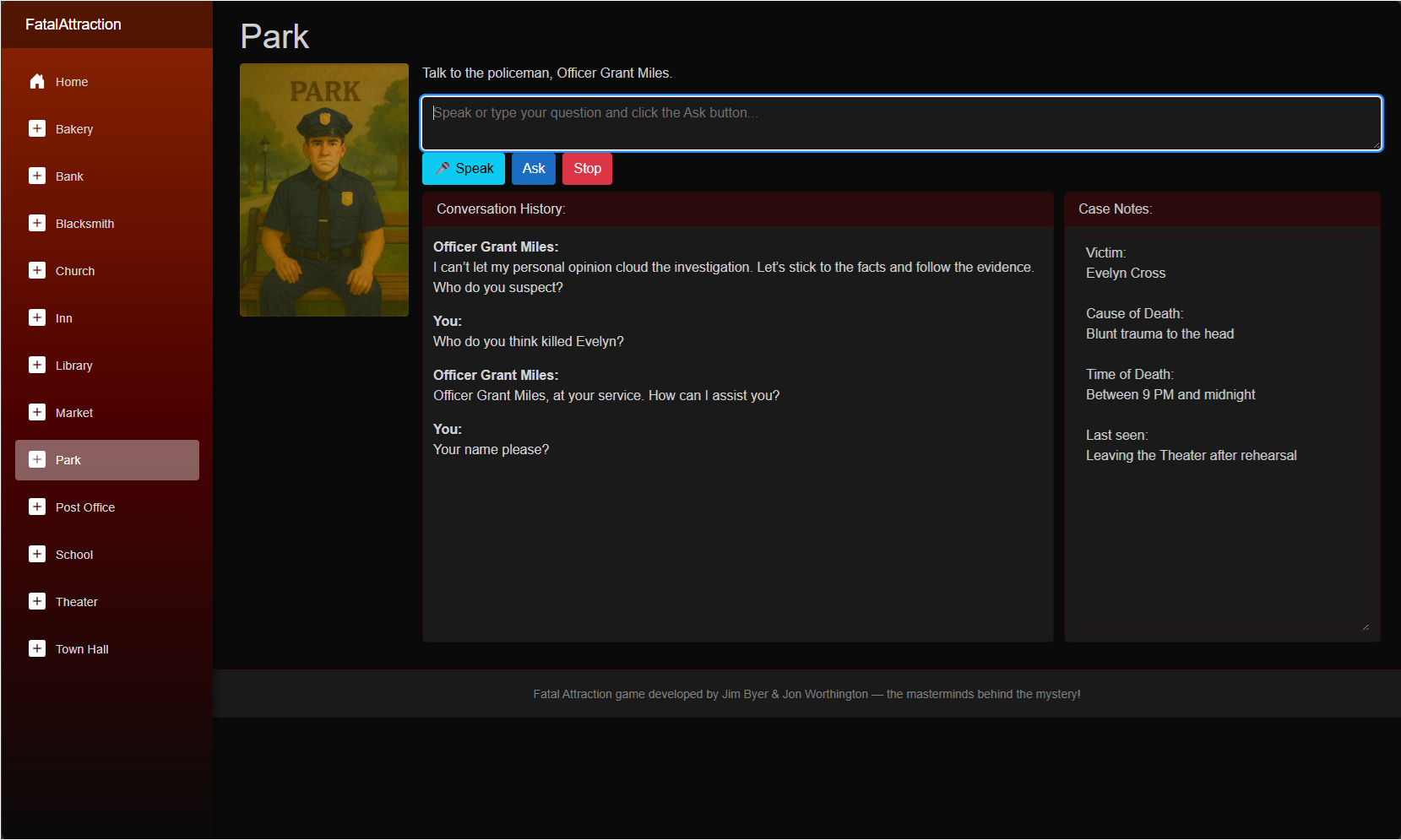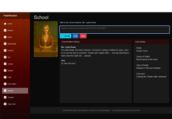 In the quiet town of Larkspur Hollow, an attractive little town, the body of Evelyn Cross, a beloved actress who once performed at the local theater, is found dead in the park at dawn. The townsfolk whisper it was a crime of passion — but everyone seems to have been attracted to Evelyn in some way, and everyone's hiding something. Interview each (AI-generated) character to uncover motives, lies, and secrets — and ultimately identify the killer. Good luck!